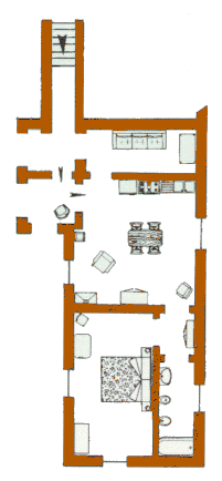 La Scala ( 2+2 posti letto) situato al primo piano è costituito da un soggiorno con angolo cottura, divano letto matrimoniale e caminetto, una camera matrimoniale con letto aggiunto,